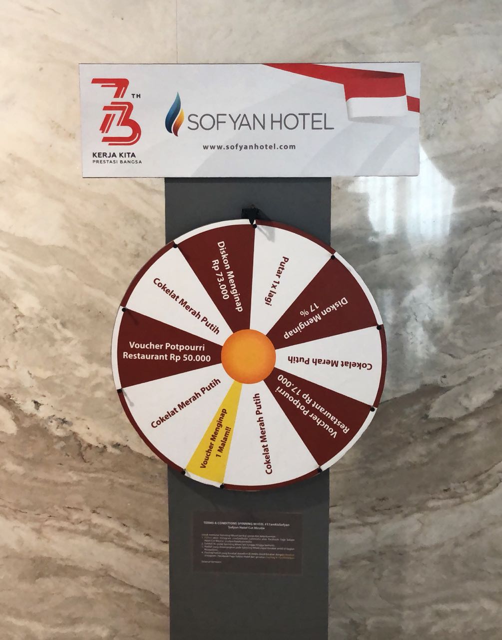 Di ulang tahun negara tercinta Republik Indonesia ke 73 tahun, Sofyan Hotel memberikan potongan diskon sebesar Rp 73.000 , bagi yang beruntung di program Spinning Wheel Sofyan Hotel.